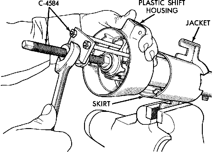 17. On 1985 - 87 Lancer and LeBaron GTS, pull shift housing from shift tube using puller C-4584 or equivalent, remove shift housing extension, then withdraw shift tube from lower end of column.