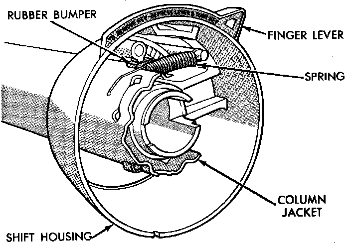 18. On models with floor shift, remove spring securing shift housing to mast jacket, rubber bumper and the shift housing.