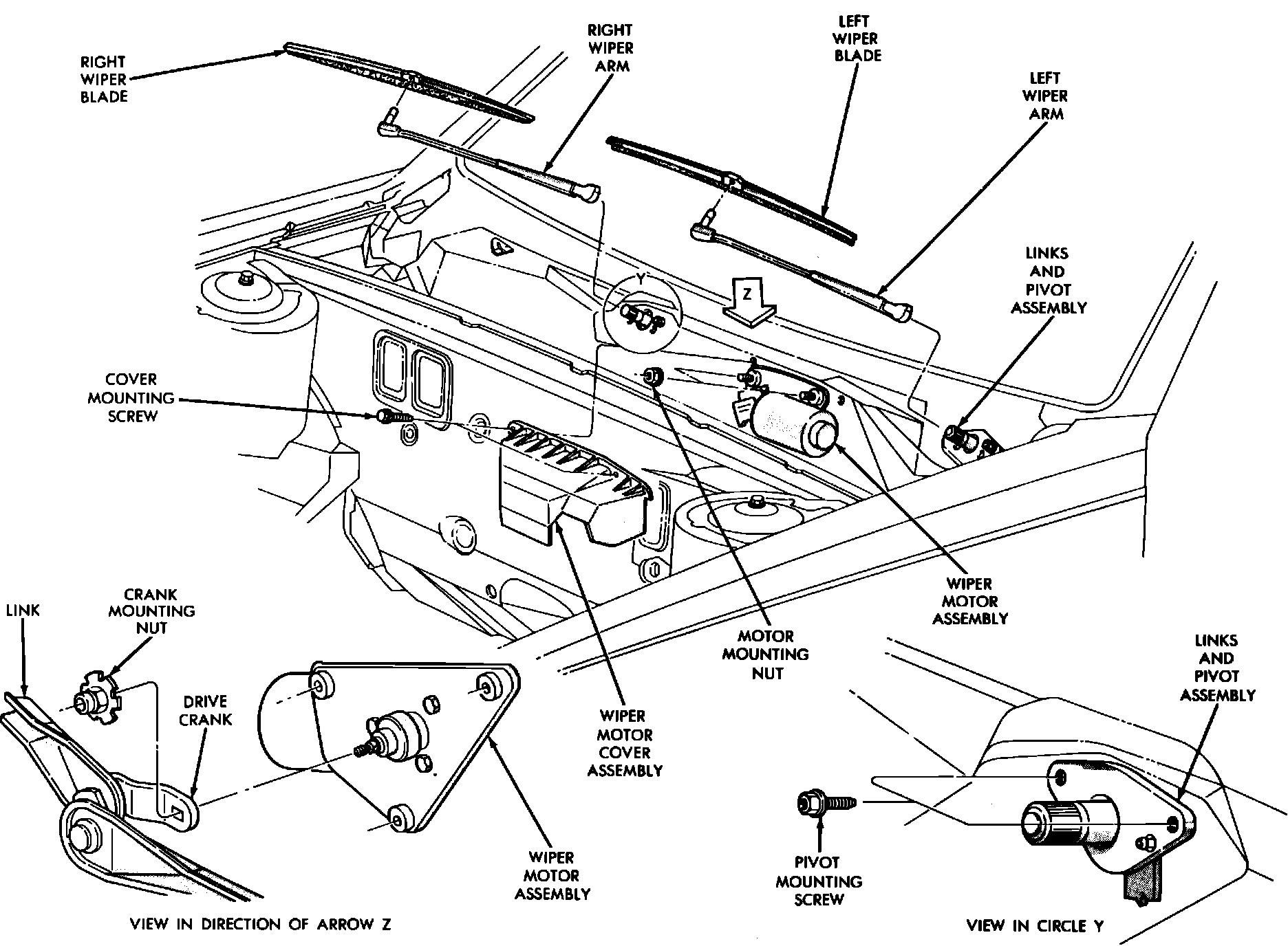 8. Push pivots down into plenum chamber, pull motor out until it clears mounting studs and then as far to the driver's side (outboard) as it will go. Pull right pivot and link out through opening, then shift motor to opposite side (inboard) of opening and remove motor, left link and pivot.