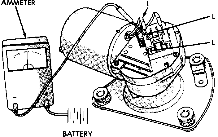 1. Disconnect wiring harness connector at motor. Remove wiper arms and blades. Connect an ammeter between battery and motor terminal "L."