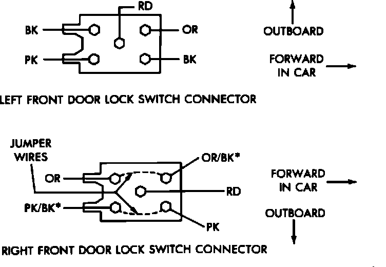 1. Remove the right door switch from the door panel and disconnect the wires from the back of the switch. Connect jumper wires as indicated to the right door wiring harness. These jumper wires take the place of the switch in the inactive position. Operate the door locks using the left door switch.