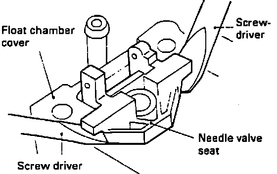 9. Using flat blade screwdrivers, pry up the needle valve seat at both edges to remove. Use care not to damage the float chamber cover when prying up the needle valve seat.