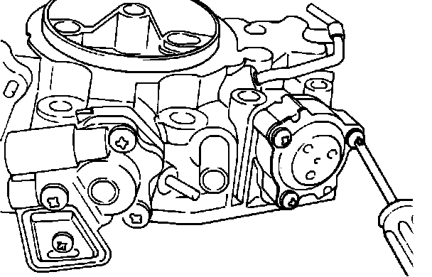 7. To remove the float chamber cover assembly, insert a screw driver blade between the enrichment cover and the float chamber cover, as illustrated. Pry lightly while lifting up slowly. Do not apply excessive force.