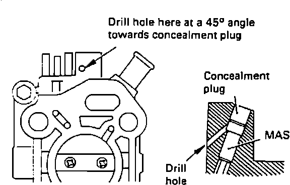 40. For removal of the concealment plug, clamp carburetor base plate in a vice and drill a (5/64 in.) pilot hole in the casting surrounding the idle mixture adjusting screw (MAS) then redrill the hole to (1/8 in.)