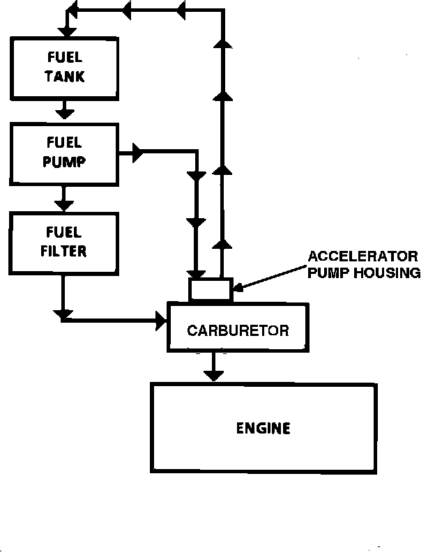 The fuel delivery components consist of fuel supply and delivery lines, a mechanical fuel pump and a fuel filter assembly. The Fuel return portion of the fuel system consists of lines and couplings and includes the vapor recovery system. The function of the return line is to recover excess fuel vented from the fuel pump check valve (to relieve excess pump pressure) and return it through the accelerator pump housing, to the fuel tank. The return line is a low pressure part of the fuel system.