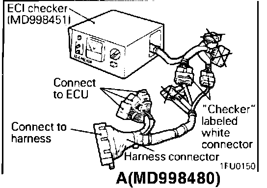 (7) Connect white color connectors, with labeled "CHECKER", of the ECI HARNESS CONNECTOR F to the connectors of ECI checker, and then connect ECI HARNESS CONNECTOR F to the ECU and the harness connectors.