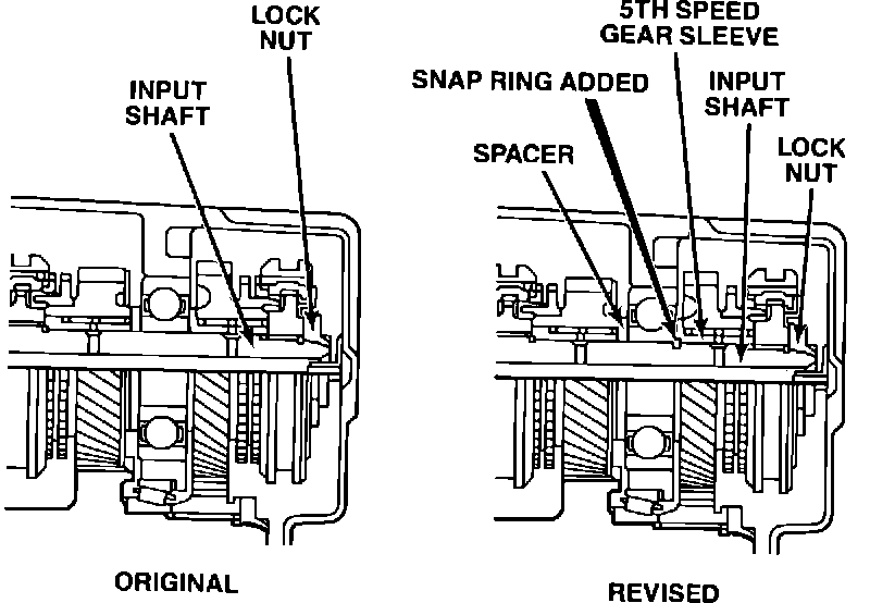 Effective January 1, 1988 the input shaft and 5th speed gear sleeve have been revised and a snap ring has been added to the input shaft of the KM200 series 5-speed transaxle, as shown in Figure 1.