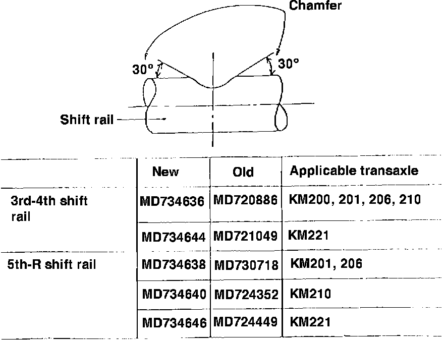 The interlock plunger groove in the 3rd-4th shift rail (4 and 5 speed transaxles) and the 5th-reverse shift rail (5 speed transaxle) have a 30~ chamfer. Figure 1.