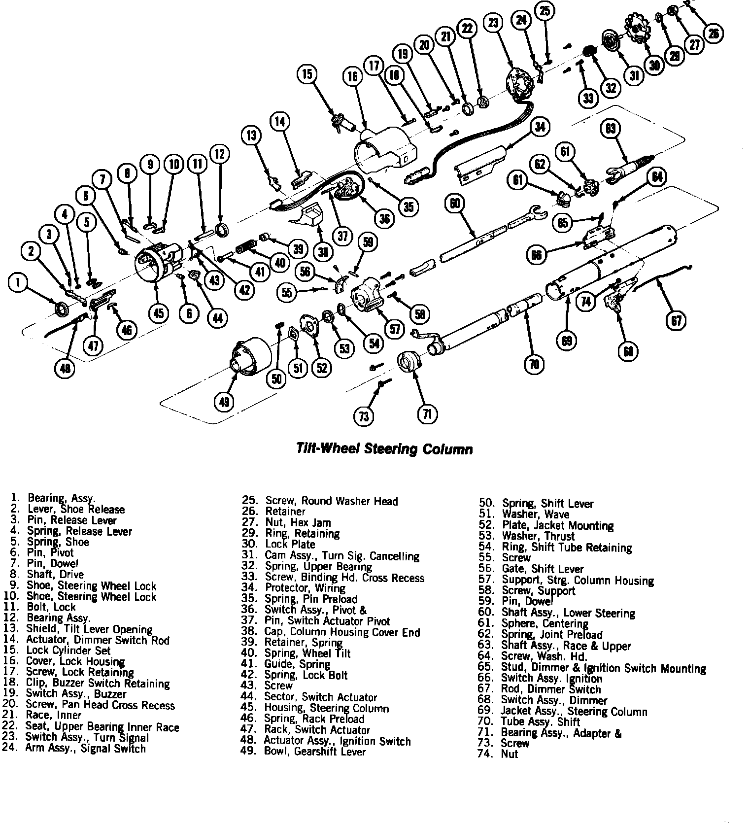 Tilt Column - Remove plastic cover (if equipped) from lock plate. Depress lock plate with tool C-4156 and pry retaining ring out of groove with screwdriver. The full load of the upper bearing spring should not be relieved; if it is, the retaining ring will turn too easily making removal more difficult. Remove the lock plate, cancelling cam, and upper bearing spring. Place turn signal switch in right turn position, remove screw which attaches link between turn signal switch and wiper/washer switch pivot. Remove screw which attaches hazard warning switch knob. Remove three screws attaching turn signal switch to steering column.