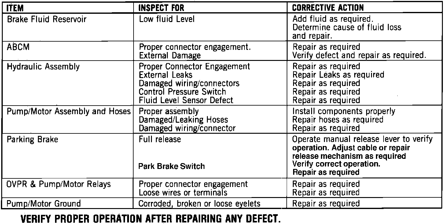 1. Check for low brake fluid level and/or system leakage which could cause low hydraulic pressure.