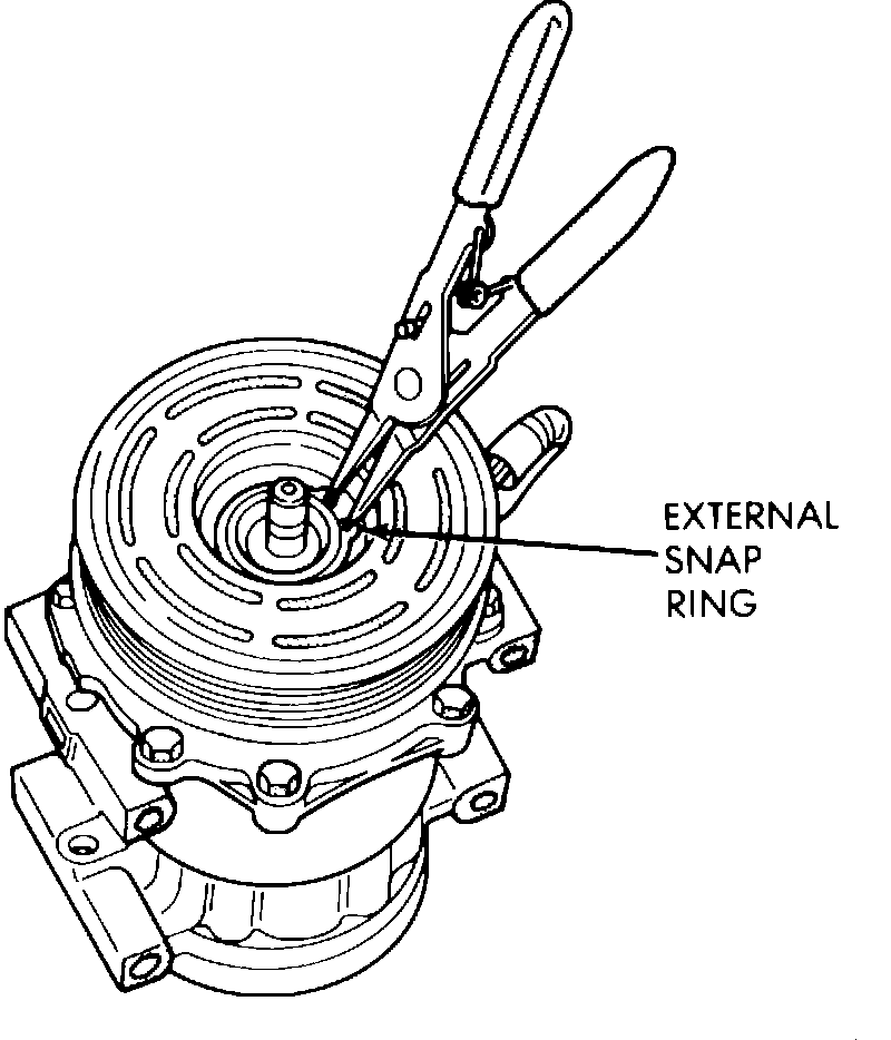 5. Remove external snap ring then install suitable rotor pulley puller into rotor cavity so that lips on puller jaws engage snap ring groove. Remove rotor pulley from compressor.
