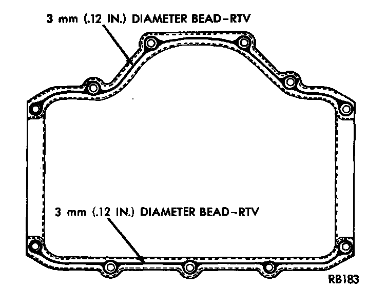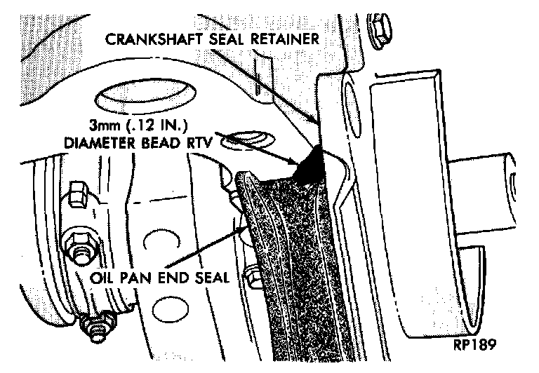 1. Apply RTV to the pan rail and at the front seal retainer parting line on the 2.5L engine.