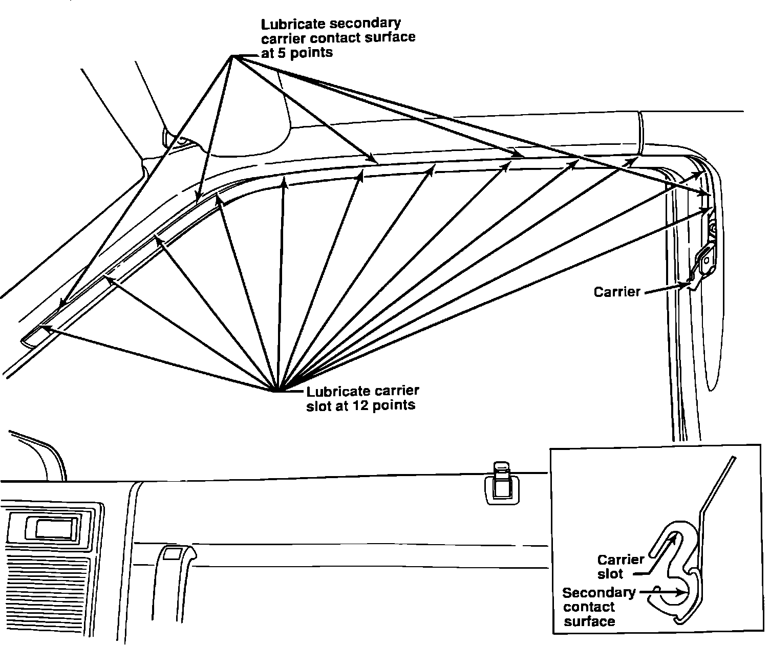 ^ Apply a 1/4" diameter dot of lubricant at 5 points along the secondary carrier contact surface on the rail as shown in the figure.