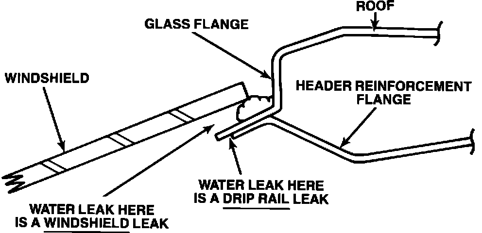 2. Water passing between the sheetmetal glass attaching flange and the header reinforcement flange (Figure 1). This type of leak would be considered a drip rail water leak. Proper diagnosis can be determined by localizing the water flow to just the drip rail area. Constructing a dam with strip caulk (dum dum) is helpful to isolate the location of the leak.