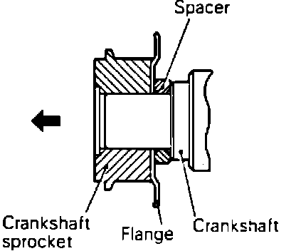 13. Remove crankshaft sprocket spacer and flange, camshaft sprockets, oil pump sprocket and timing belt tensioner as needed.