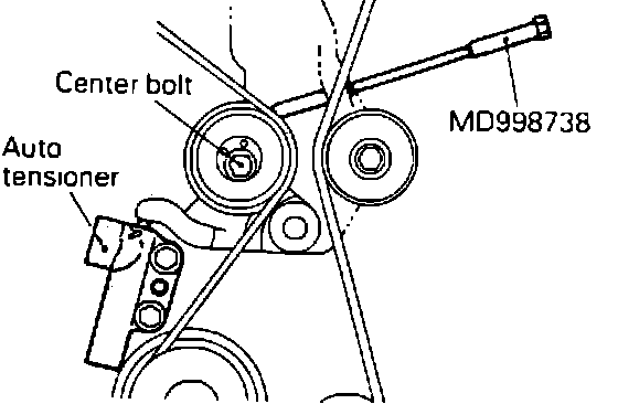 b. Loosen tensioner pulley center bolt, then using wrench tool No. MD998752 or equivalent, and a torque wrench, apply a torque of 1.88 - 2.03 lb-ft, Fig. 21. Use a torque wrench capable of measurement within a range of 0-2.2 lb-ft. If vehicle body interferes with torque wrench, use a jack to slightly raise engine.