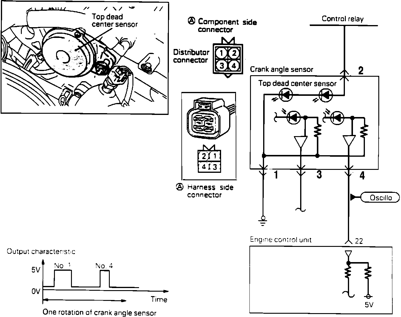 1. Connect test leads from the oscilloscope to the #4 terminal of the sensor connector and run the engine at idle speed.