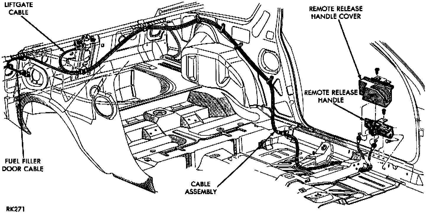 1. The original cables used to operate both fuel filler door and liftgate are clamped to each other and inseparable. For fear of damaging a cable still in good working condition, do not attempt to separate and remove any cable. Place the replacement cable over the original.