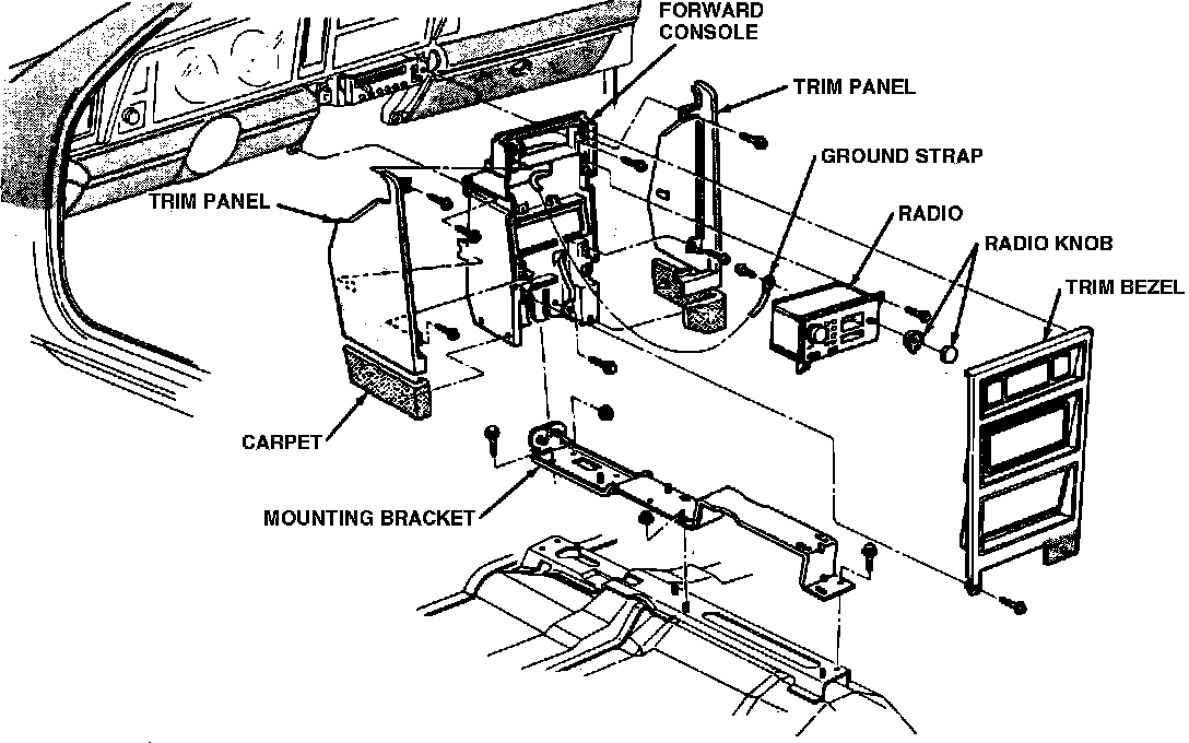 l. Reach behind forward console, then disconnect antenna, wiring and ground strap from radio.