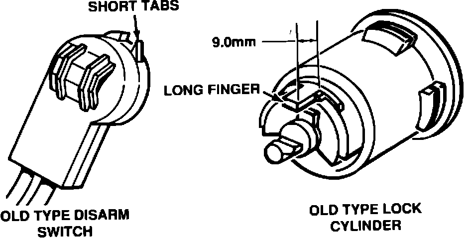 On vehicles equipped with an old type disarm switch, the replacement lock cylinder must be an old type lock cylinder (Figure 1). If old type lock cylinders are not available, then the lock cylinder and the disarm switch must both be replaced as a set with new type design.