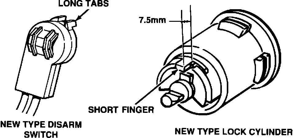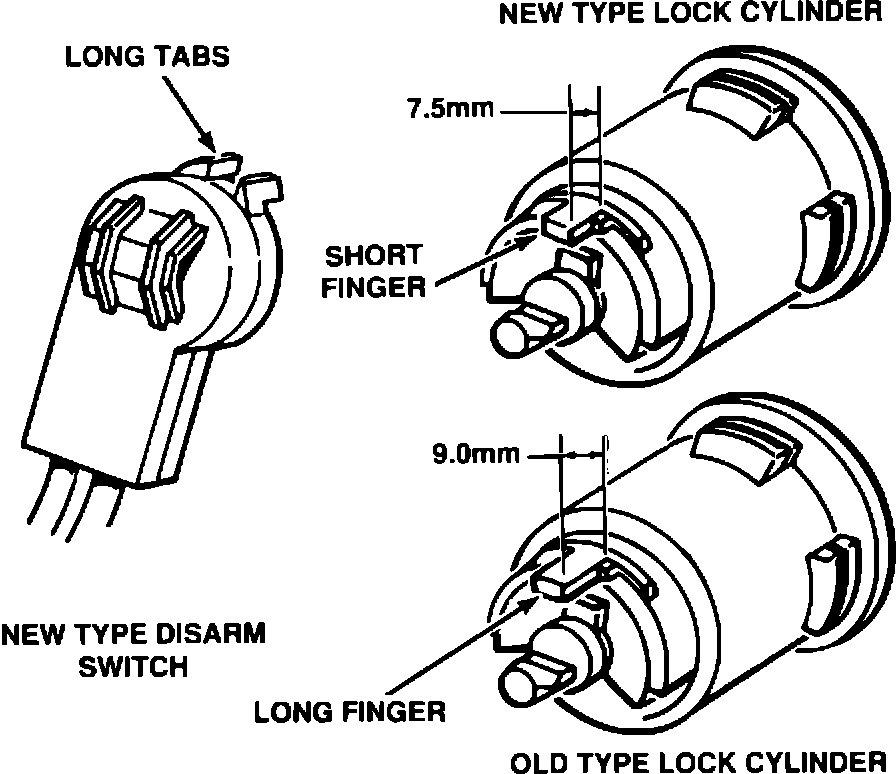 A mid-year parts revision has been made to the door lock cylinders and the door lock disarm switches. Door lock cylinders have an anti-rotation finger on them which engages tabs on the security alarm disarm switch. The new lock cylinder has a shorter finger while the new disarm switch has longer tabs.