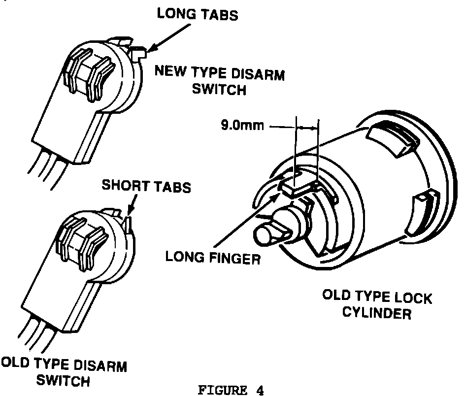 If the vehicle is equipped with an old type lock cylinder, the replacement switch may be an old type disarm switch or a new type disarm switch. If you are not sure which type of lock cylinder is on the vehicle, the replacement disarm switch must be a new type (Figure 4).