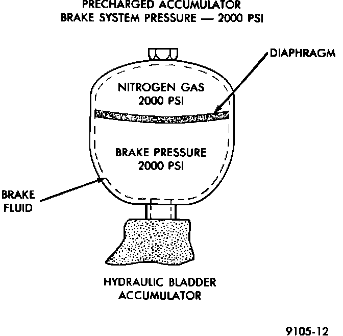 Under normal operation, the pump/motor assembly charges the accumulator to an operating pressure of between 11,032 and, 13,790 kPa (1600 psi to 2,000 psi.) As pressurized brake fluid enters the accumulator, pushing against the opposite side of the diaphragm, the nitrogen gas is compressed and increases in pressure.