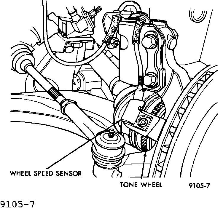 One wheel speed sensor (WSS), is located at each wheel (Fig. 7), and sends a small (AC) signal to the control module (CAB). This signal is generated by magnetic induction when a toothed sensor ring tone wheel passes a stationary magnetic sensor wheel speed sensor. The (CAB) converts the (AC) signal generated at each wheel into a digital signal. If a wheel locking tendency is detected, the (CAB) will then modulate hydraulic pressure to prevent the wheel(s) from locking.