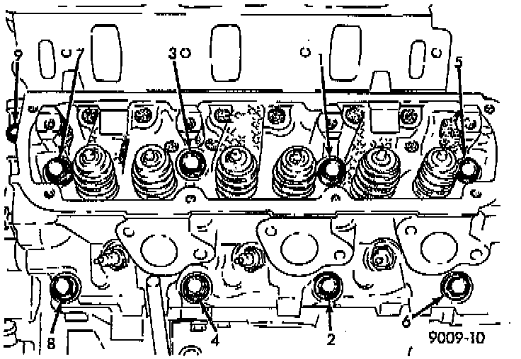 6. Remove the 9 head bolts from each cylinder head and remove cylinder heads Fig. 7.