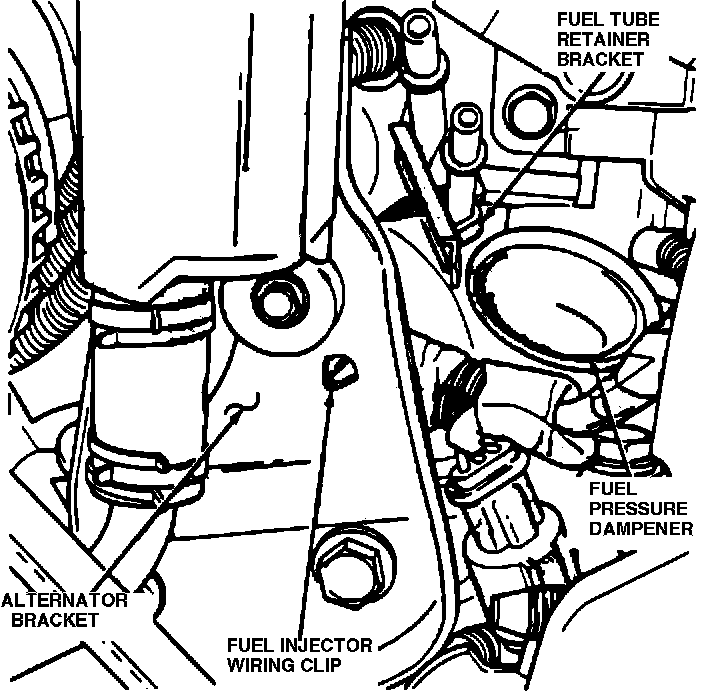 (20) Remove fuel tube retainer bracket screw and fuel rail attaching bolts (Fig. 9). Spread the retainer bracket to allow fuel tube removal clearance.