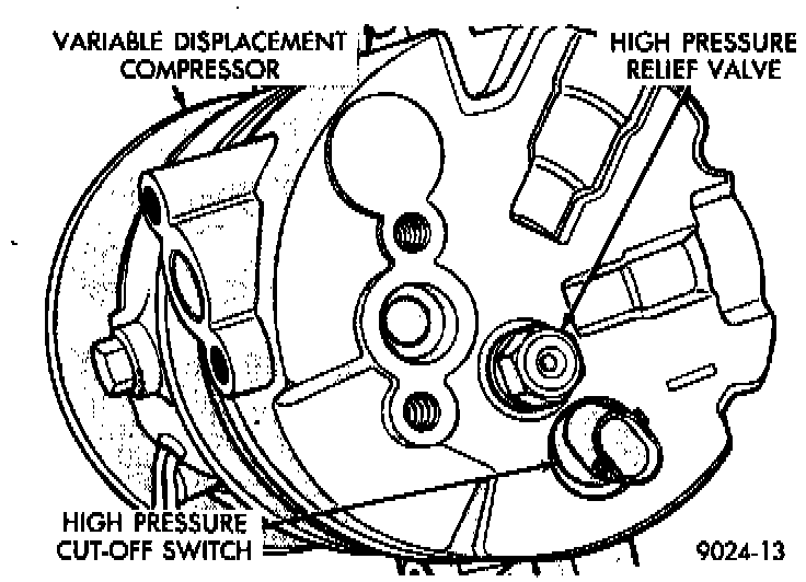 The High Pressure Cut Out (HPCO) Switch is located on the rear cover of the Variable Displacement Compressor. The function of the switch is to disengage the compressor clutch by monitoring the compressor discharge pressure. The HPCO Switch is electrically connected in the same circuit as the Low Pressure Cut Out Switch, and the Ambient Switch.