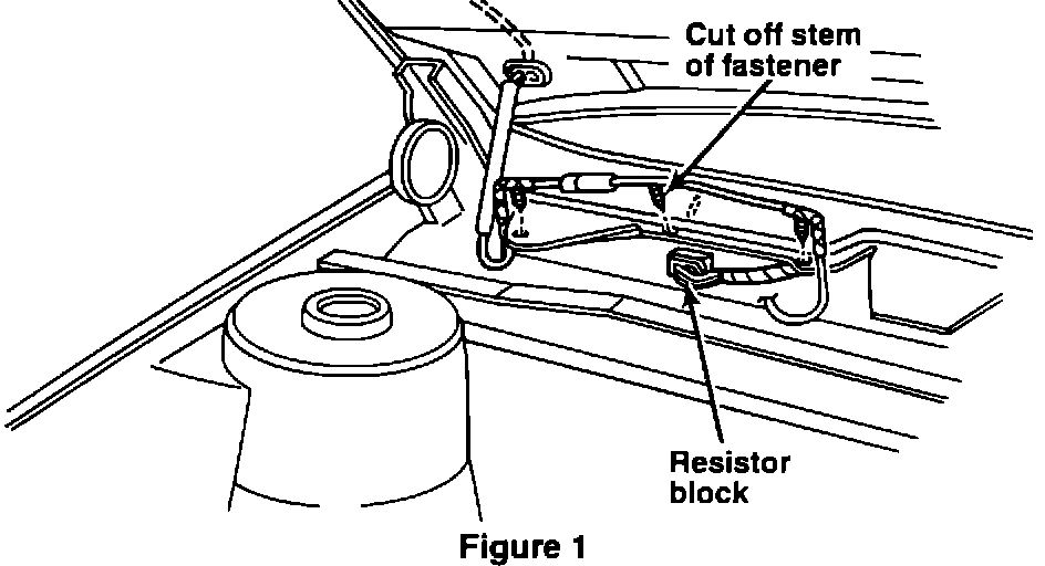 7. Disengage the snap-in fastener securing the underhood lamp wiring to the cowl at the location above the resistor, (Figure 1).
