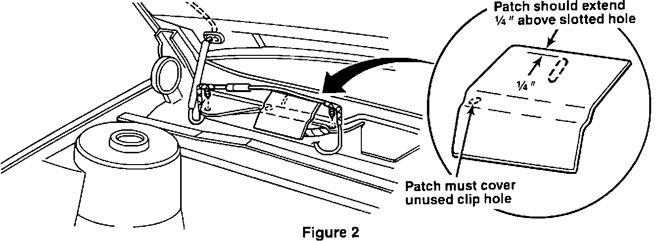 12. Install the larger of the supplied mastic patches to the cowl so that it completely covers and seals both the hole that was used for the underhood lamp fastener and the slotted hole adjacent to it, (Figure 2).