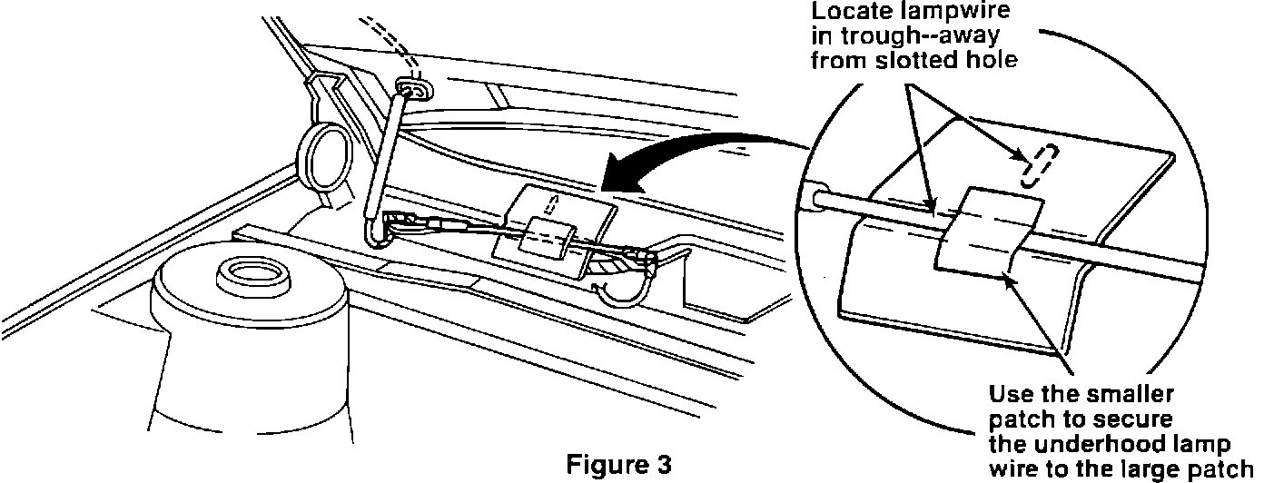 13. Use the supplied, smaller mastic patch to secure the underhood lamp wire to the large mastic patch in the location shown in Figure 3.