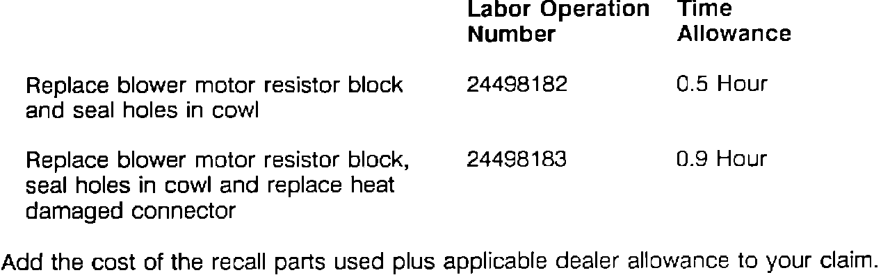 To correct the condition, your dealer will replace the resistor block and seal the area above it. In addition, the dealer will inspect the resistor block wiring connector for heat damage and replace it if necessary.