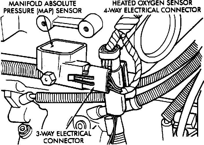 The voltage supplied to the MAP sensor from the engine controller is 5 volts, and its voltage range is .5 to 5 volts. .5 to 1.5 volts indicates a high vacuum situation such as idle or deceleration. 1.5 to 3.0 volts indicates a medium level of vacuum such as a cruise or slight acceleration condition. 3.0 to 4.5 volts indicates a low vacuum situation such as hard acceleration or a mechanical failure. Any reading of 0 volts or over 5 volts indicates a problem. Refer to specification chart in ELECTRICAL SPECIFICATIONS.
