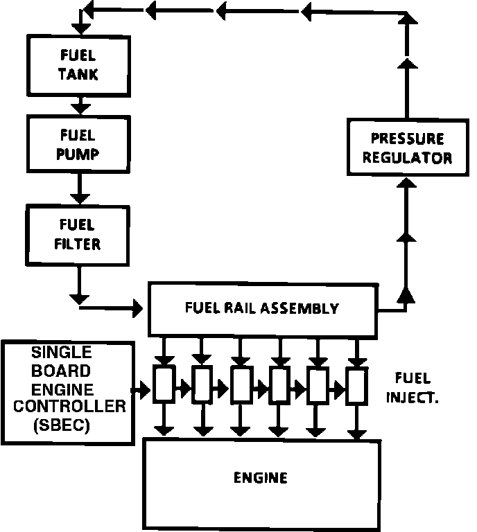 The fuel delivery system consists of the fuel tank, fuel pump, fuel filter, fuel pressure regulator, fuel rail, 6 fuel injectors and associated lines, hoses, and controls. Fuel is pumped from the fuel tank to the fuel rail and fuel injectors, through the fuel pressure regulator, and returns to the tank via a fuel return line. The Single Board Engine Controller (SBEC) controls the fuel flow through the injectors, and excess fuel returns to the fuel tank, through the fuel return line.