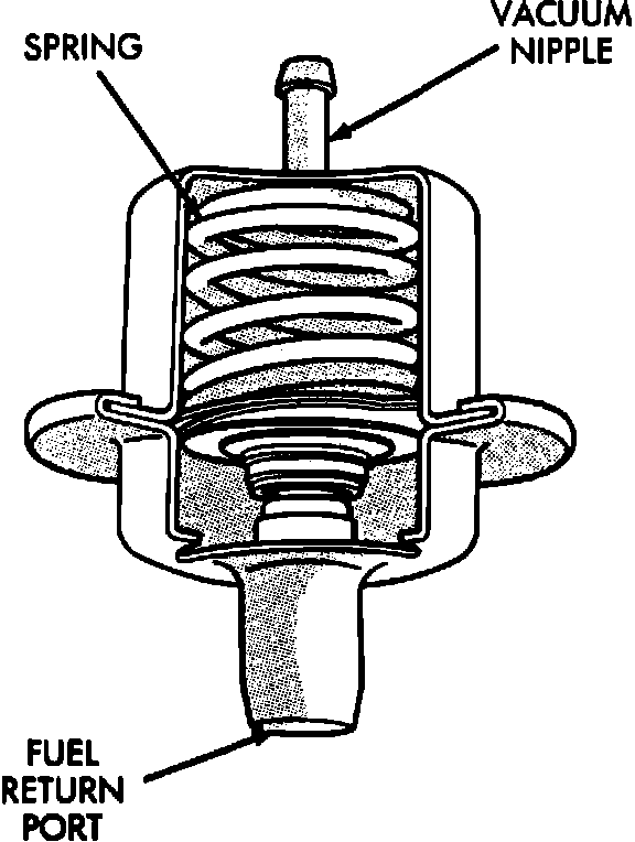 The fuel pressure regulator is used to maintain a constant pressure of 48 psi (330 kPa) in the fuel supply system. The pressure regulator uses a vacuum assisted spring loaded diaphragm to control the fuel return port in order to maintain constant pressure. Pressurized fuel is delivered to the fuel rail and then flows through the injectors or the pressure regulator. When fuel pressure acting on the regulator diaphragm exceeds 48 psi (330 kPa), the regulator spring is compressed and the fuel return port is opened. When fuel pressure drops below 48 psi (330 kPa), spring tension causes the diaphragm to block the fuel return port. As manifold vacuum increases during deceleration, less pressure is needed to supply the same amount of fuel into the air flow. In order to fine tune the fuel pressure under all operating conditions, the vacuum assists in opening the fuel port during high vacuum conditions.