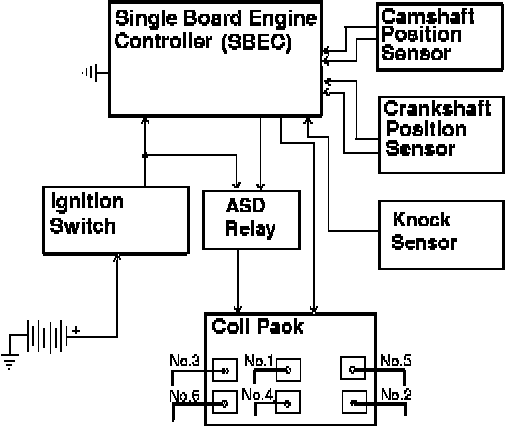 The ignition system consists of a Single Board Engine Controller (SBEC), its sensors, a crankshaft position sensor and cam position sensor that send crank and cam speed and position information to the SBEC, and a molded ignition coil unit. The Single Board Engine Controller (SBEC) controls the entire ignition system. It gives the capability of igniting the fuel mixture according to different engine conditions during engine operation by delivering a variable electronic spark advance curve. The SBEC has a built in microprocessor that continually receives input from the engine monitoring sensors. The computer then electronically advances or retards the ignition timing to provide good driveability during operation. During the CRANK-START period the SBEC will provide a set amount of advanced timing to assure a quick efficient start. The amount of electronic spark advance provided by the SBEC is determined by three input factors, coolant temperature, engine rpm, and manifold vacuum. The SBEC also receives information from the oxygen sensor and electronically adjusts the air-fuel mixture to assure the most efficient fuel burn possible. The SBEC also controls the Auto Shut-Down (ASD) Relay, which provides power to the ignition coil, fuel pump, oxygen sensor heater element, and fuel injectors.