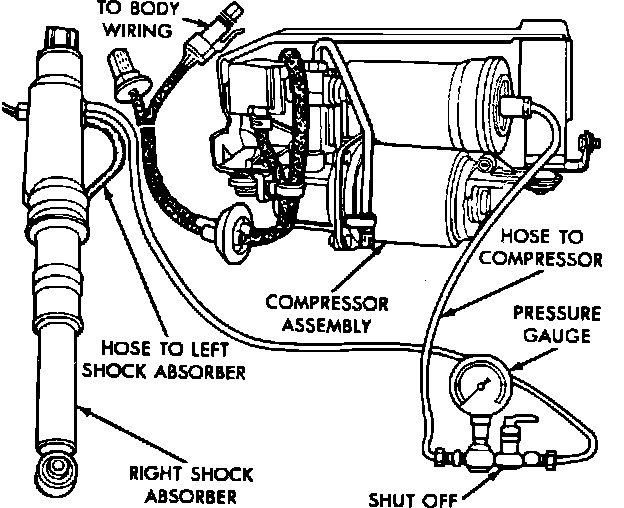7. If system will not inflate beyond 50 psi, a severe leak may be indicated. Also check for pinched pressure line between compressor and shocks.