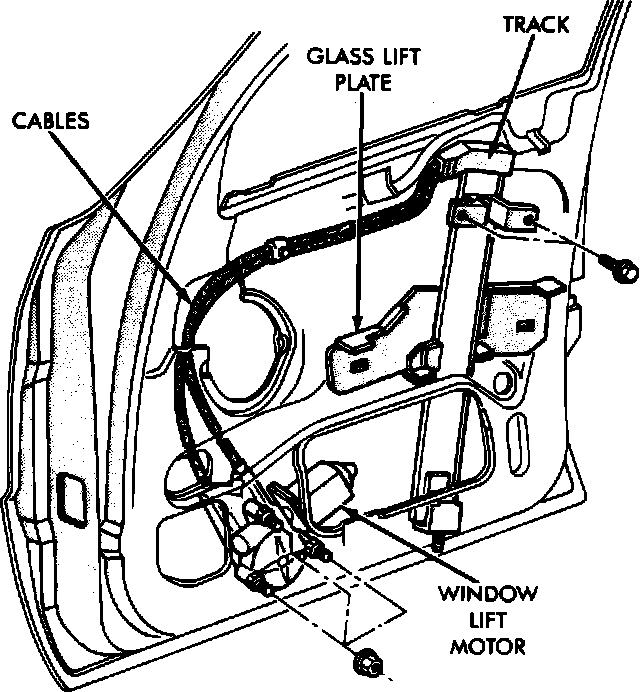 2. Anchor the regulator and motor with the original nuts and bolts. Install the cable retaining clips to the inner door panel.
