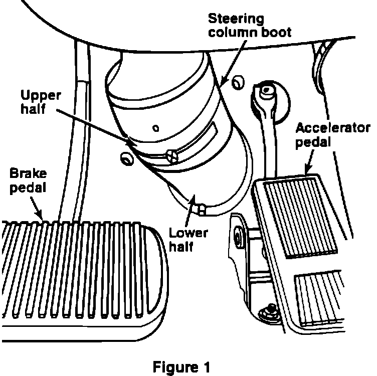 6. Disengage the lower boot half flange from the floor pan (flange secured with snap-in retainers) to expose the lower coupling.