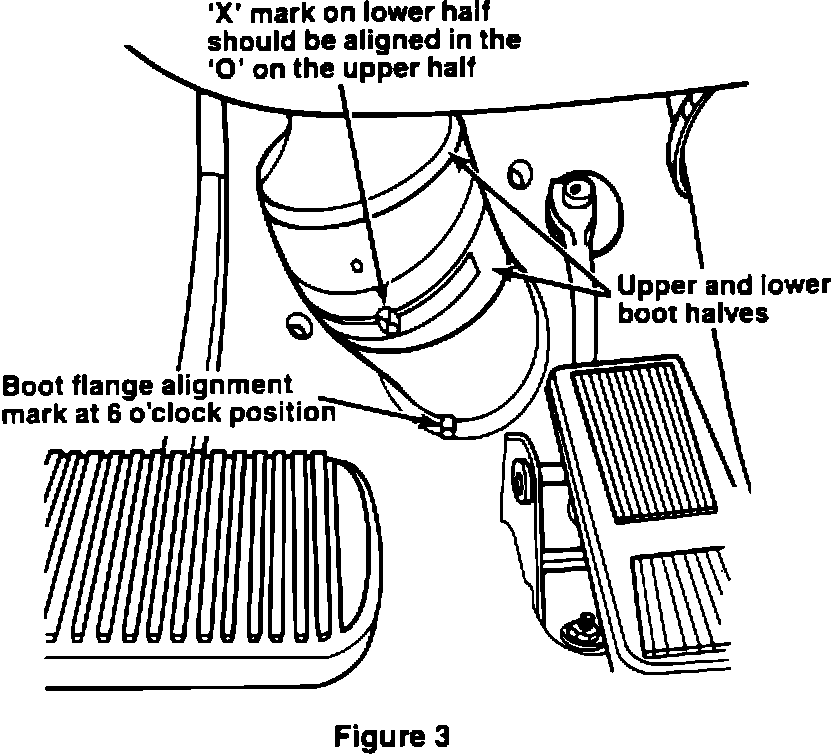 When installing the two-piece boot, the "X" marked on the lower half should be aligned in the "O" on the upper half, and the flange should be installed in the floor pan with the "notch" mark at the 6 o'clock position (Figure 3).