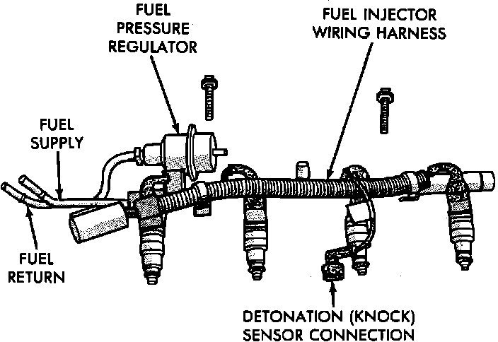 The fuel rail performs the dual functions of fuel supply to the injection components, and providing the necessary brackets and fittings to mount the components to the engine. Fuel enters the fuel rail at the inlet tube, proceeds to the 4 fuel injectors, then to the fuel pressure regulator where it returns to the tank. The fuel rail is under constant fuel pressure and fuel pressure release is required prior to servicing.
