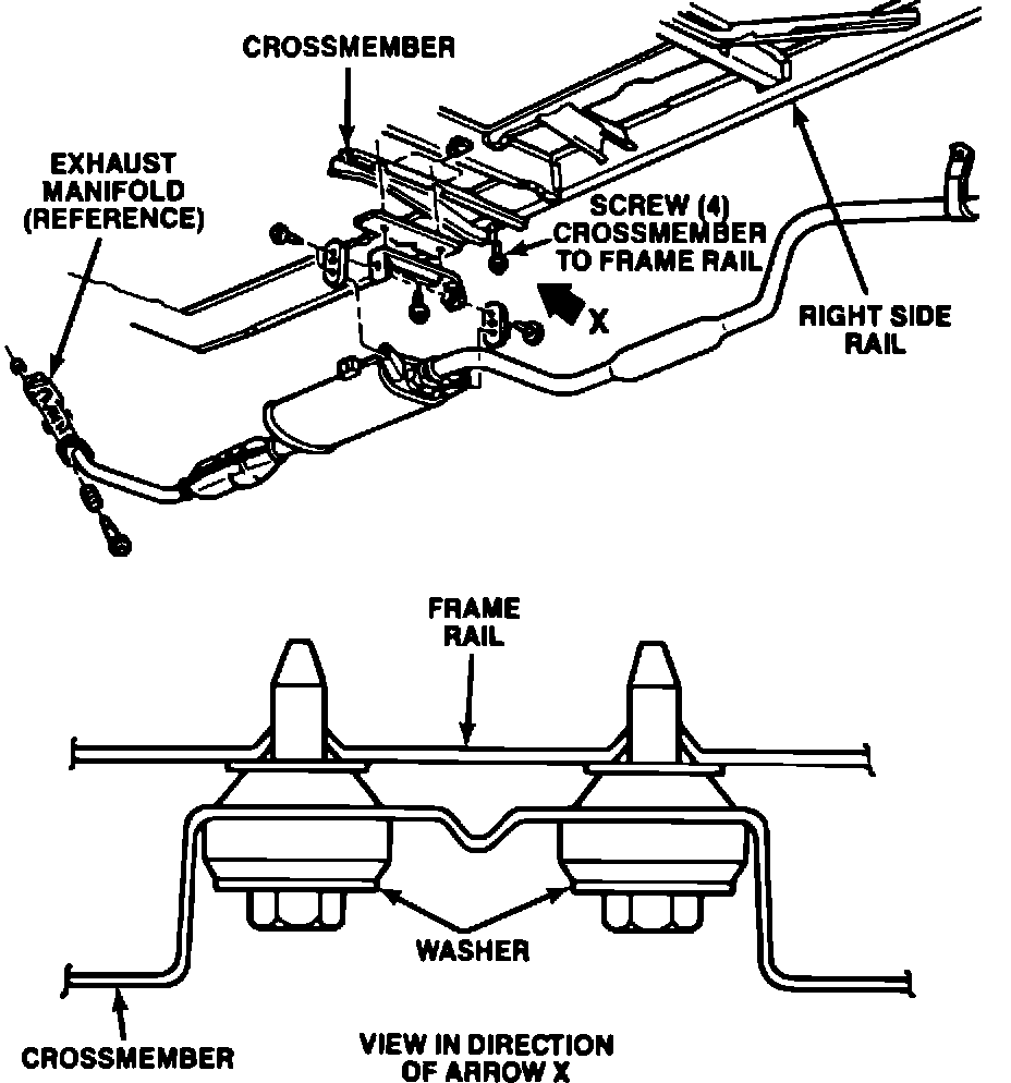 >> Before performing the repair procedure on Caravan/Voyager vehicles, verify that the washers for the muffler crossmember to frarne rail bolts (Figure 1) are not contacting the crossmember. If washer-to-crossmember clearance is sufficient, and a squeak is still present, proceed with the following repair. <<