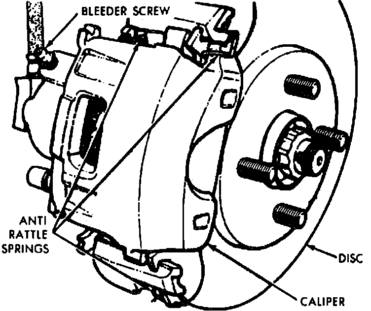 The caliper assembly consists of a rotor, caliper, pad, and adapter. The single piston caliper assembly floats through a rubber bushing on a single pin, threaded into the adapter. The bushing is inserted into the inboard portion of the caliper. Two machined abutments on the adapter, position and align the caliper fore and aft. The guide pin and bushing controls the movement of the caliper and the piston seal to assist in maintaining proper pad clearance.