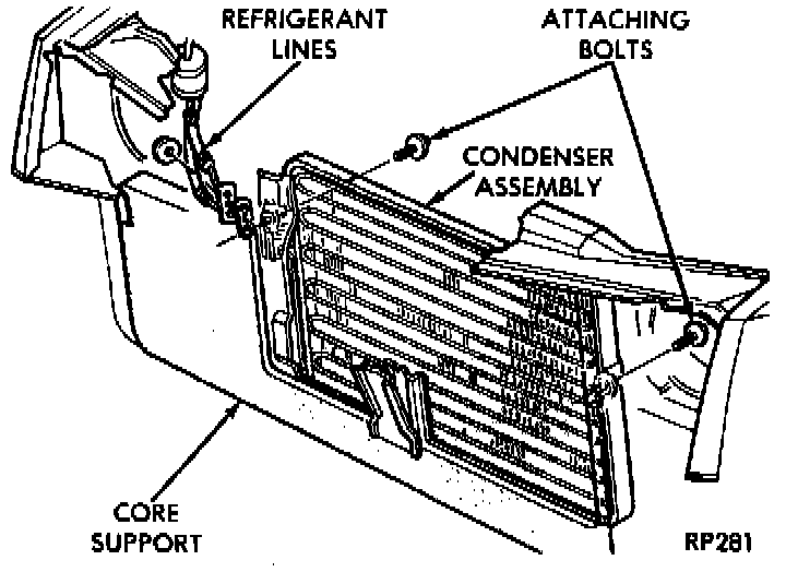 4. Remove two bolts securing the condenser assembly to the radiator core support and lift the condenser assembly from vehicle.
