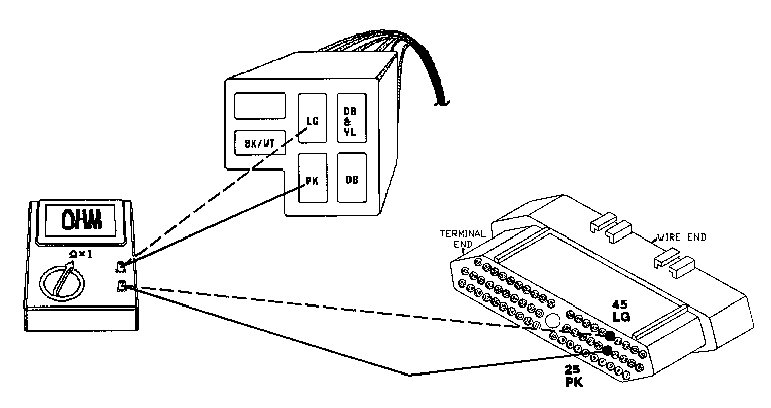 2. Test the PK and the LG wires for continuity between the Diagnostic connector and cavities 25 and 45 of the Engine Controller 6-way.