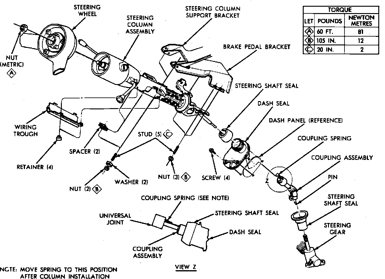 1. Align and insert lower stub shaft into coupling, raise column into position and loosely install bracket nuts. Pull column assembly rearward and torque nuts to 105 lb-in.