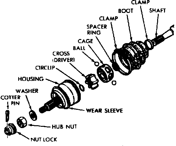 8. If constant velocity joint is noisy or badly worn, replace entire unit. The repair kit will include boot, clamps, circlip and lubricant. Clean and inspect joint as outlined in the following steps.